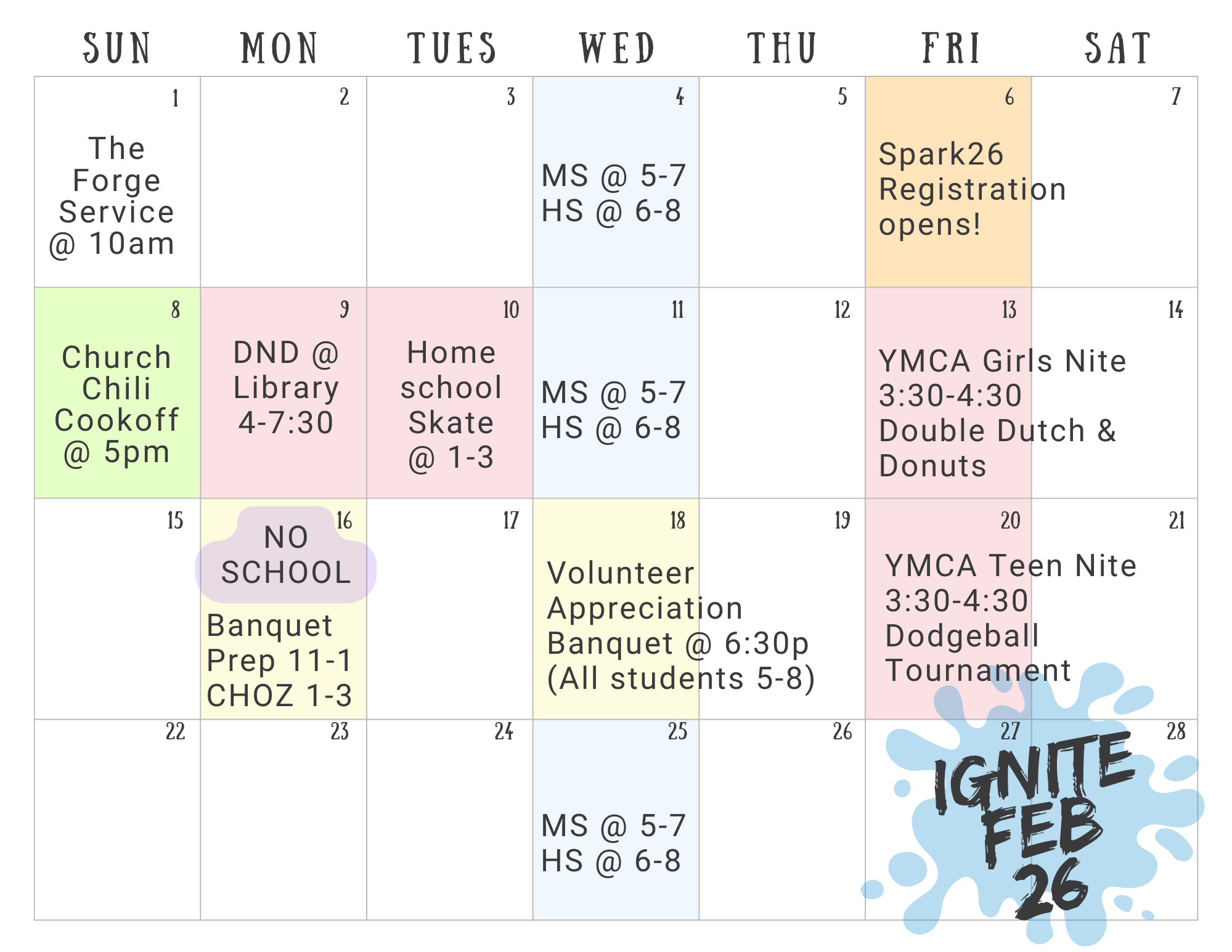 The Forge Sparta is excited to be hosting our youth students (6th grade and up) for an in house weekend retreat - SPARK26: ABIDE!